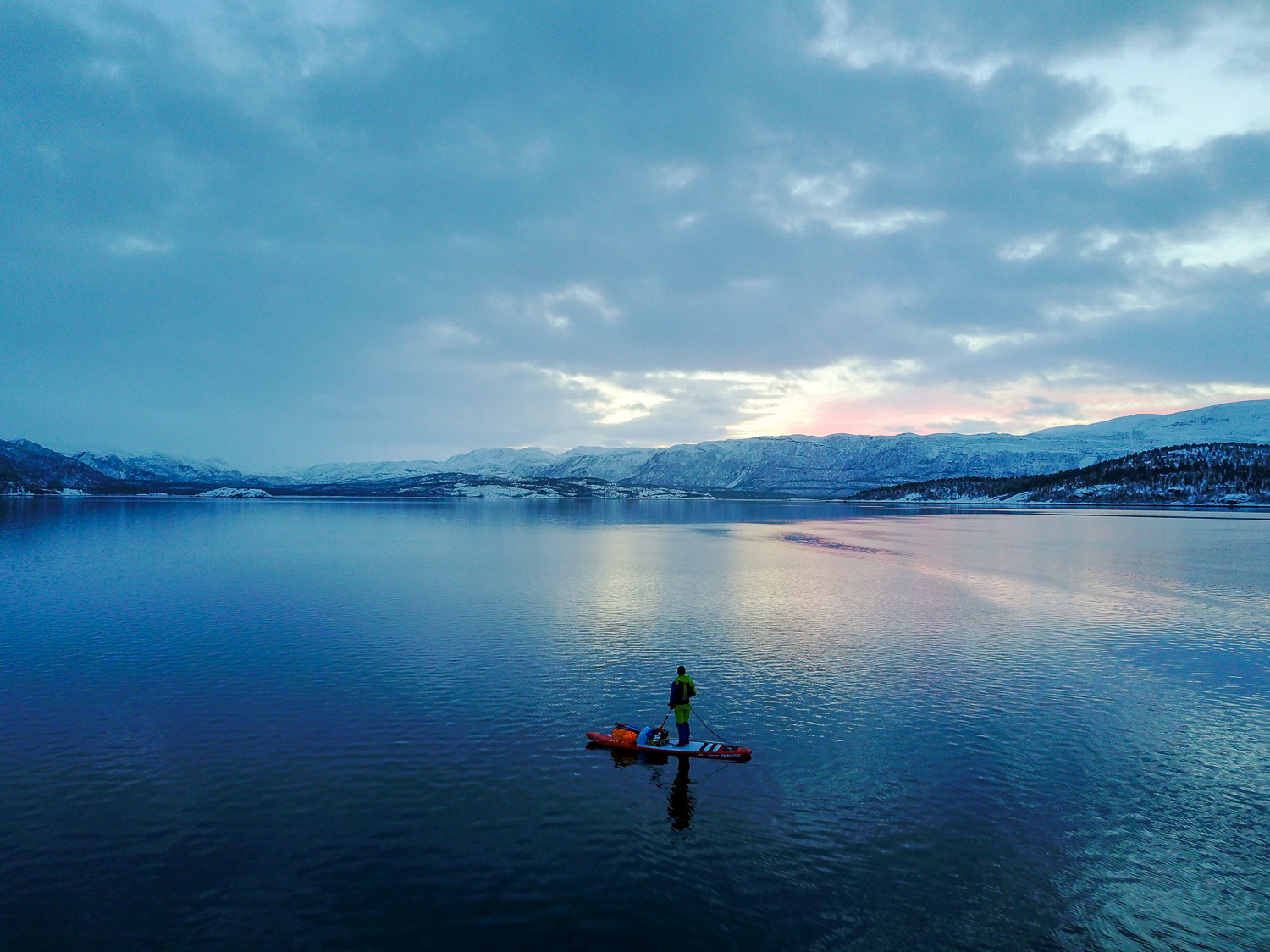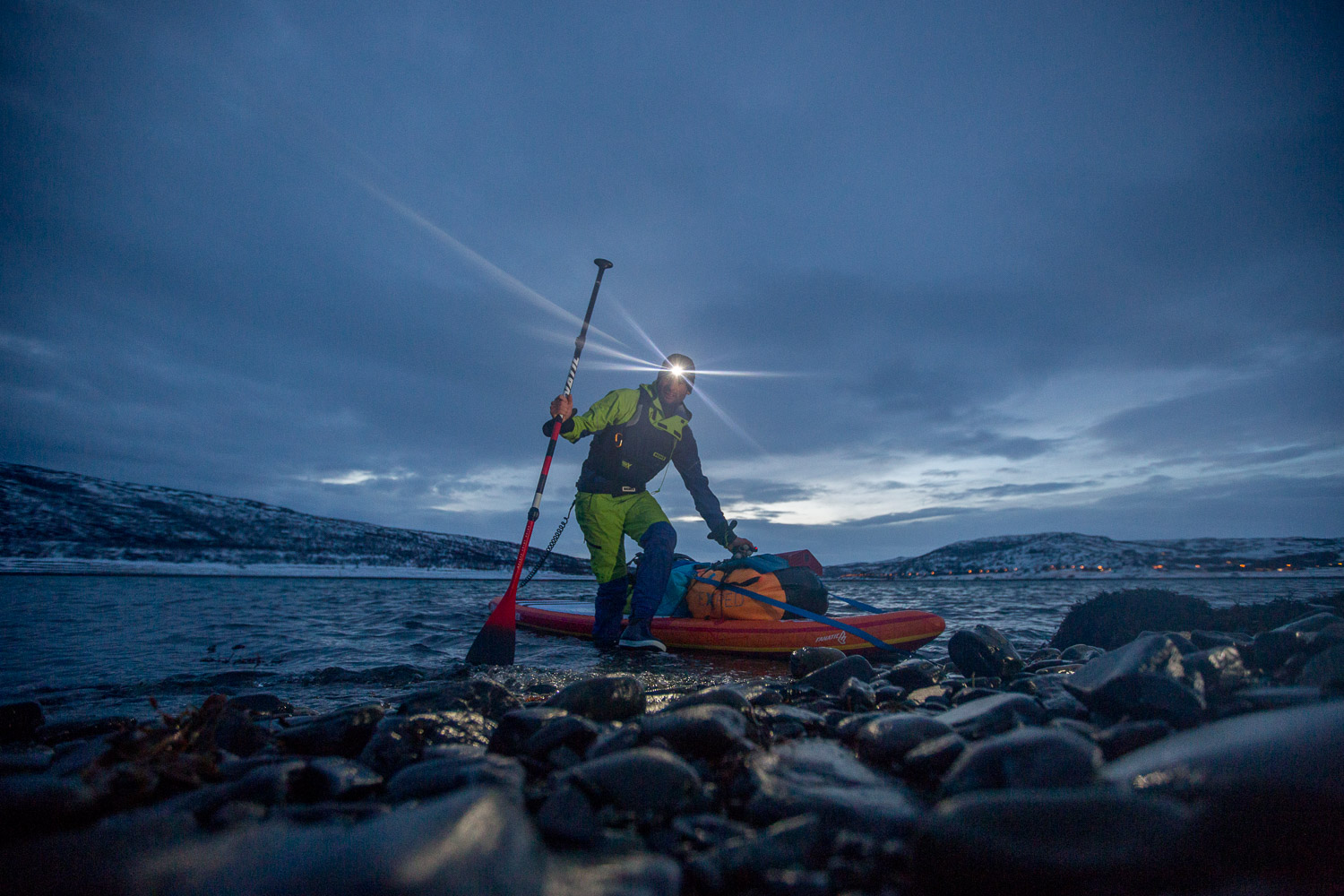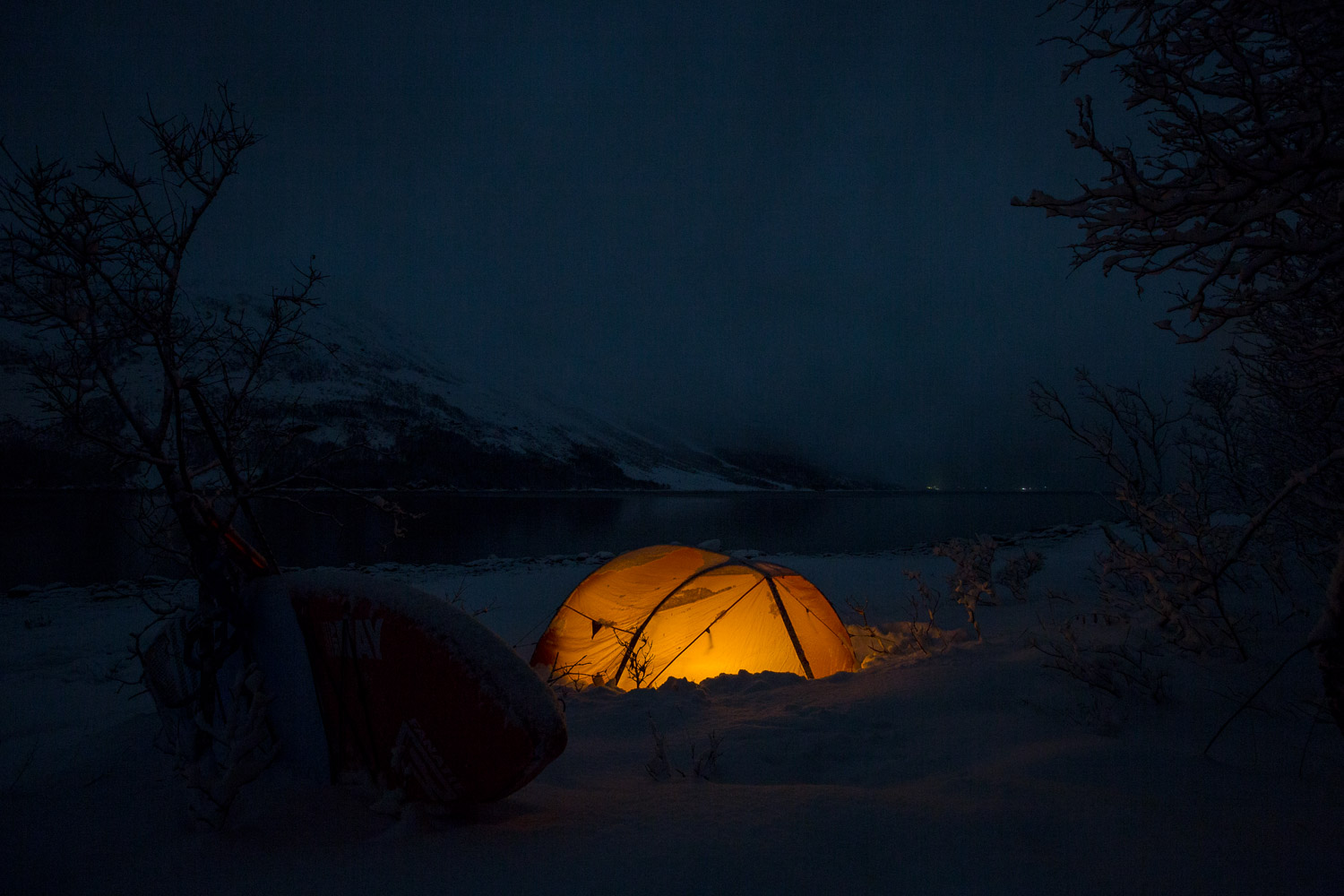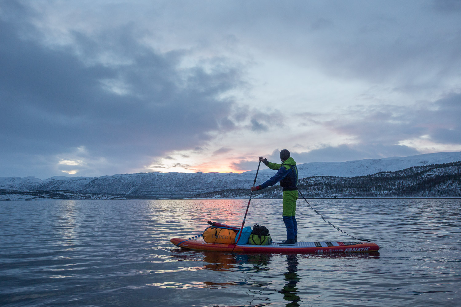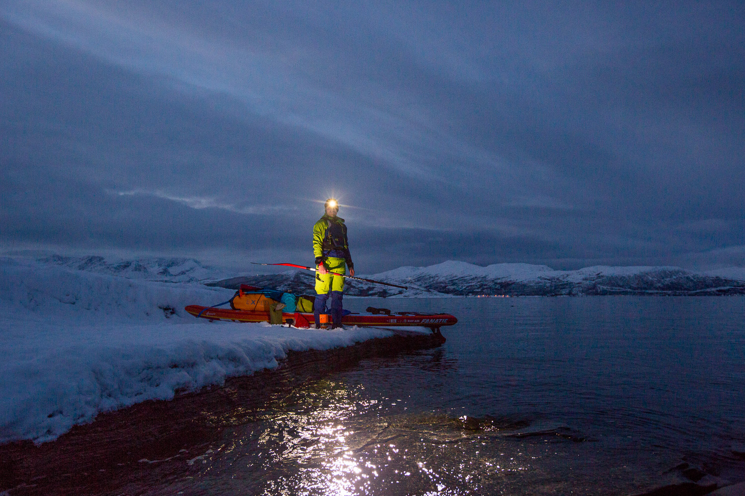 Var det ikke for mørket, så visste vi ikke om sternene. Gäbe es das Dunkel nicht, wüssten wir nicht von den Sternen. Meine Mikroexpedition sollte nicht während den warmen Sommermonaten stattfinden. Ich brauchte wieder einmal den Kampf mit den Elementen. Warum also nicht die Herausforderungen annehmen und Norwegen in der dunkelsten Jahreszeit erleben? Nachdem ich in Tromsø von einem Schneesturm empfangen wurde und die Temperaturen ins Bodenlose fielen, hinterfragte ich genau diese Entscheidung mit jedem Paddelschlag: Wieso tue ich mir das nur an? Bei Minustemperaturen aus dem Zelt kriechen, um danach bis zu zehn Stunden durch die Dunkelheit paddeln zu können. Ja wenn das nicht Spass und Freude verspricht. Peitschende Winde, welche das Wasser zu Wellenbergen auftürmen und mein SUP Board beinahe zum kentern bringen. Toll, ein Sturz könnte das Ende meiner Expedition bedeuten, denn aus Nässe und Kälte wird bekanntlich Eis. Doch genau da lag die Faszination meiner Reise verborgen. Die Momente, als sich mein Körper nach den ersten Paddelschlägen langsam aufwärmte, waren Freudetänze für Muskel und Geist. Die Dämmerung welche sich jeden Tag für ein paar Stunden über das Land legte, war ein Geschenk der Sonne, welches mich jeden Tag aufmunterte. Der Rückenwind, der mich zusammen mit der einsetzenden Ebbe vorantrieb, war Entspannung pur. Und nachdem sich die Wolken nach einer langen, kräfteraubenden Woche lichteten und ich das Nordlicht zum ersten Mal in meinem Leben sah, war ich einfach nur glücklich.