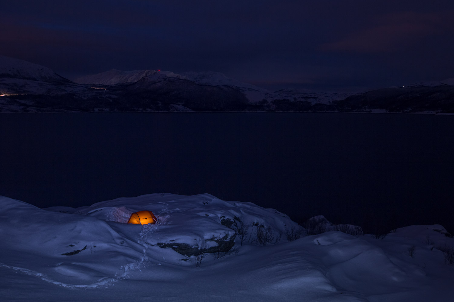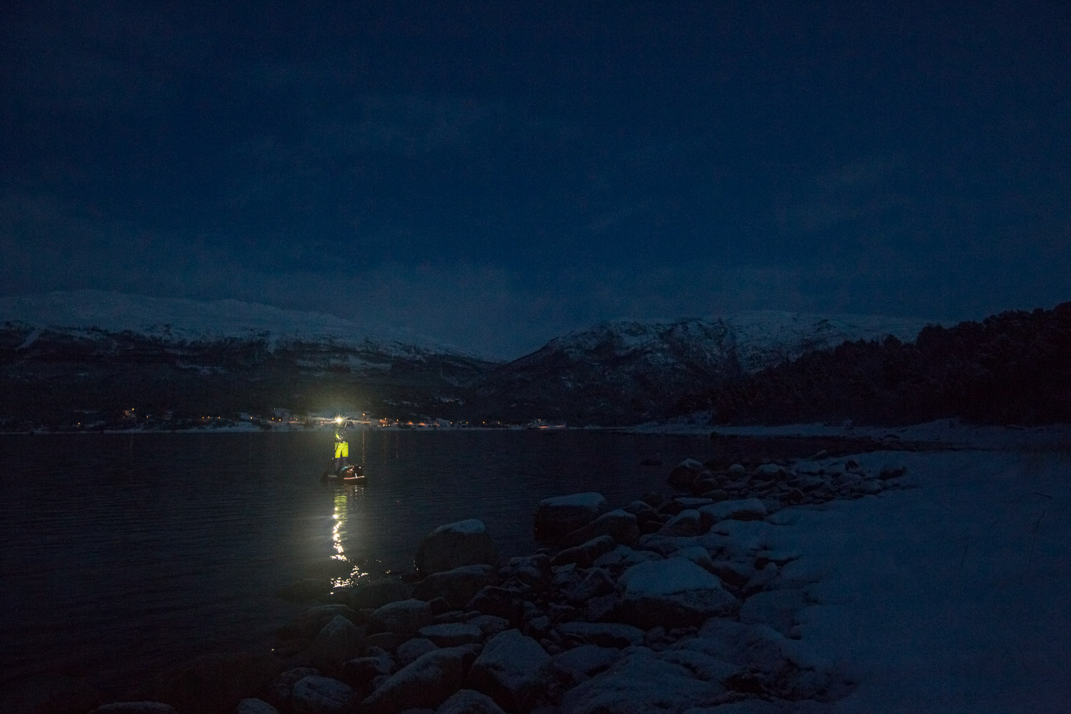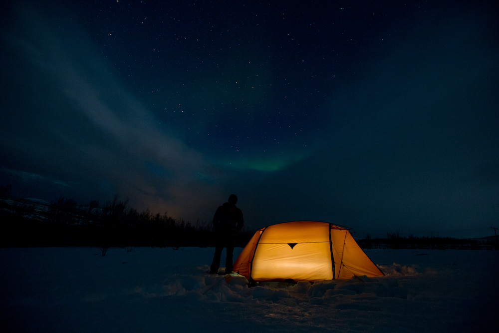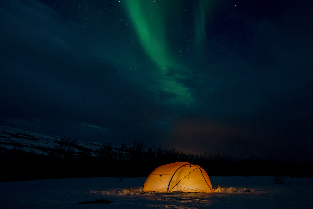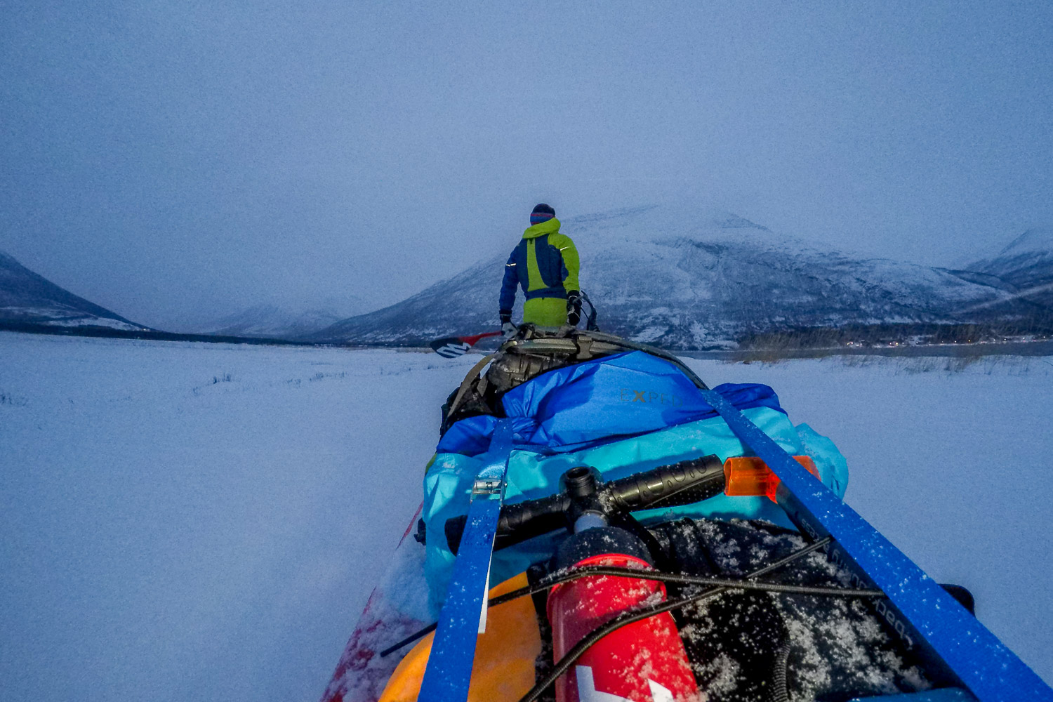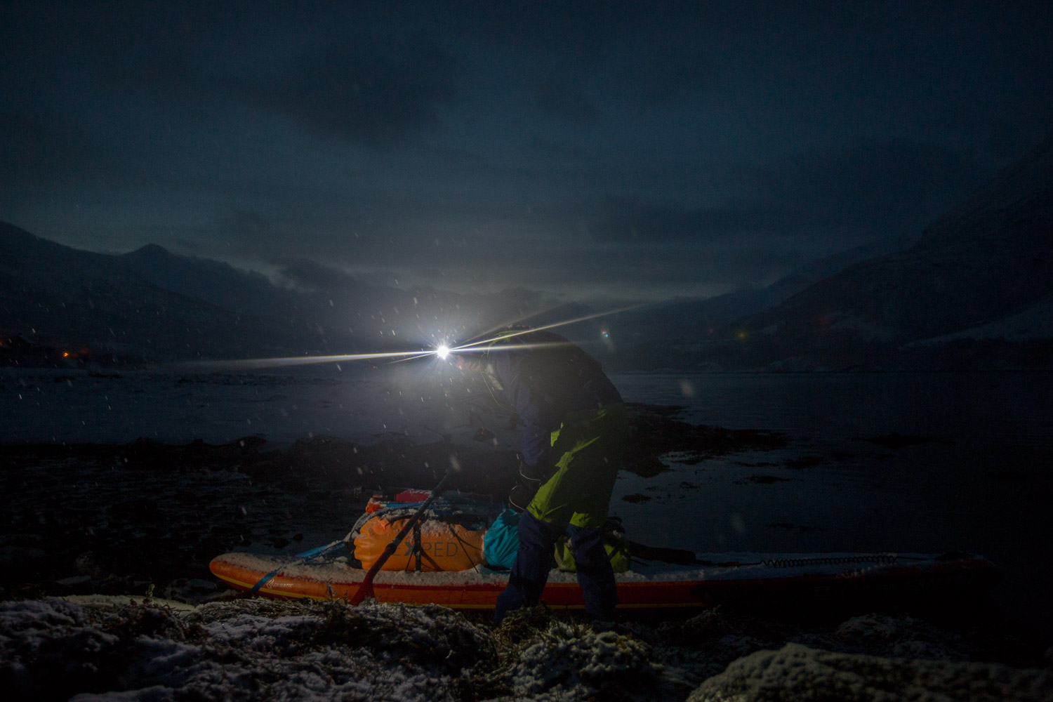 Var det ikke for mørket, så visste vi ikke om sternene. Gäbe es das Dunkel nicht, wüssten wir nicht von den Sternen. Meine Mikroexpedition sollte nicht während den warmen Sommermonaten stattfinden. Ich brauchte wieder einmal den Kampf mit den Elementen. Warum also nicht die Herausforderungen annehmen und Norwegen in der dunkelsten Jahreszeit erleben? Nachdem ich in Tromsø von einem Schneesturm empfangen wurde und die Temperaturen ins Bodenlose fielen, hinterfragte ich genau diese Entscheidung mit jedem Paddelschlag: Wieso tue ich mir das nur an? Bei Minustemperaturen aus dem Zelt kriechen, um danach bis zu zehn Stunden durch die Dunkelheit paddeln zu können. Ja wenn das nicht Spass und Freude verspricht. Peitschende Winde, welche das Wasser zu Wellenbergen auftürmen und mein SUP Board beinahe zum kentern bringen. Toll, ein Sturz könnte das Ende meiner Expedition bedeuten, denn aus Nässe und Kälte wird bekanntlich Eis. Doch genau da lag die Faszination meiner Reise verborgen. Die Momente, als sich mein Körper nach den ersten Paddelschlägen langsam aufwärmte, waren Freudetänze für Muskel und Geist. Die Dämmerung welche sich jeden Tag für ein paar Stunden über das Land legte, war ein Geschenk der Sonne, welches mich jeden Tag aufmunterte. Der Rückenwind, der mich zusammen mit der einsetzenden Ebbe vorantrieb, war Entspannung pur. Und nachdem sich die Wolken nach einer langen, kräfteraubenden Woche lichteten und ich das Nordlicht zum ersten Mal in meinem Leben sah, war ich einfach nur glücklich.