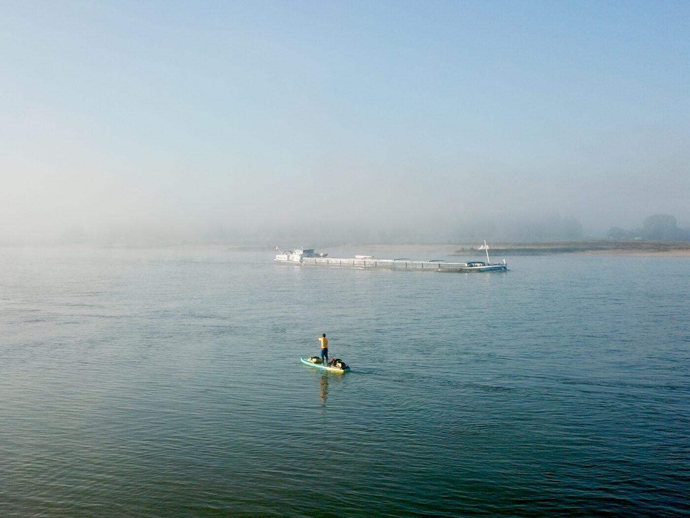 Während ich zu Beginn in der Rheinmündung kaum Strömung hatte und teilweise von optimalen Rückenwind profitieren konnte, schickt der Rhein nun erbarmungslos seine Fluten talabwärts. Schon bei leichtem Gegenwind komme ich nur noch sitzend voran oder werde flussabwärts gespült. Es ist ein erbarmungsloser Kampf gegen eine Naturgewalt, die mich gerade zum Verzweifeln bringt, die aber auch Leben und Kraft spenden kann.